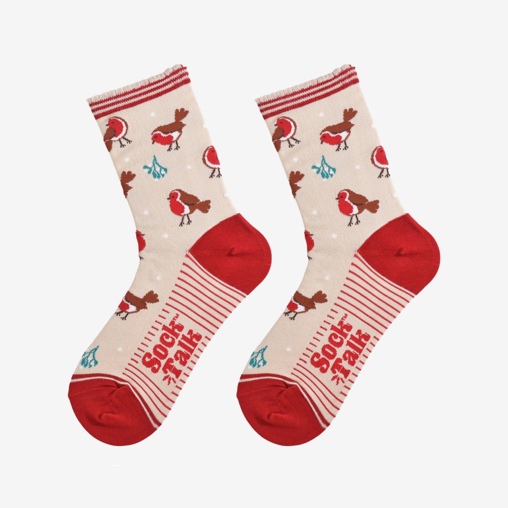 Women's luxury bamboo socks featuring playful robins and festive foliage, with a contrasting red striped scalloped cuff. Designed in the UK and crafted from soft, eco-friendly bamboo.
